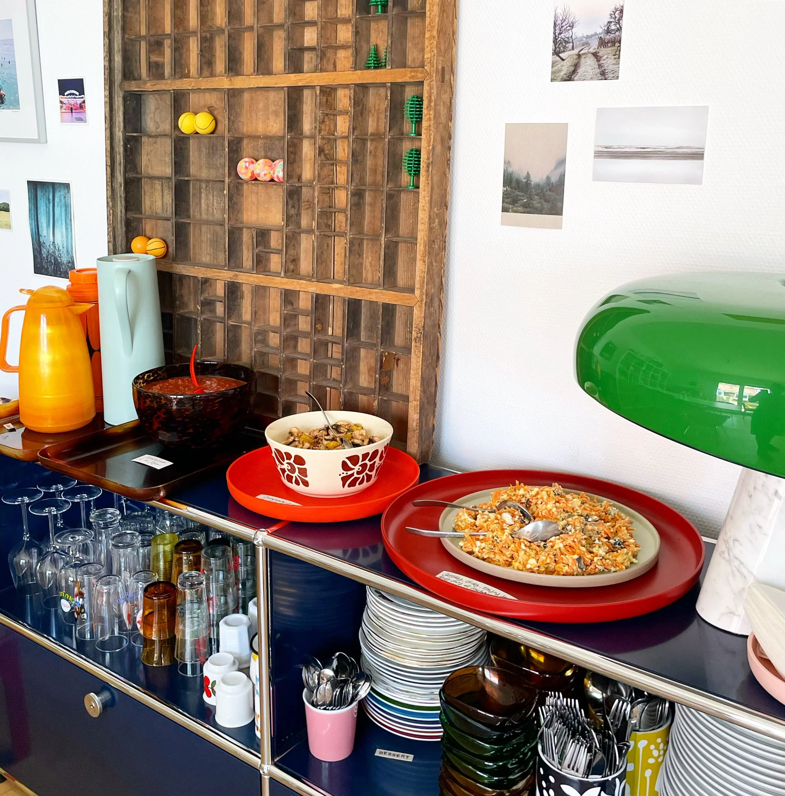 Le jour J, on arrivait à l’heure qui nous arrangeait entre 12h et 13h, on s’installait, et on déjeunait à son rythme en composant comme on voulait ses assiettes salées et sucrées au buffet. (Lors des déjeuners du jeudi, je servais en complément du buffet un plat chaud à table, et lors des brunchs du samedi, tout était directement mis à disposition sur le buffet).